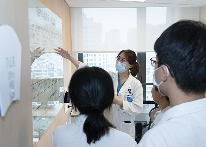 Chen Danling, Deputy Director of Obstetrics and Gynecology (left picture), and Dr. Zhao Yuchen (right picture) are explaining to trainee students in the inpatient ward
